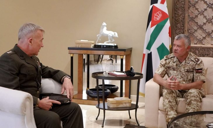 جاء ذلك خلال لقائه الخميس، مع قائد القيادة المركزية الأمريكية كينيث ماكينزي، وقائد قيادة العمليات الخاصة الأمريكية، ريتشارد كلارك، في الولايات المتحدة، حسب بيان صادر عن الديوان الملكي الأردني، الجمعة.