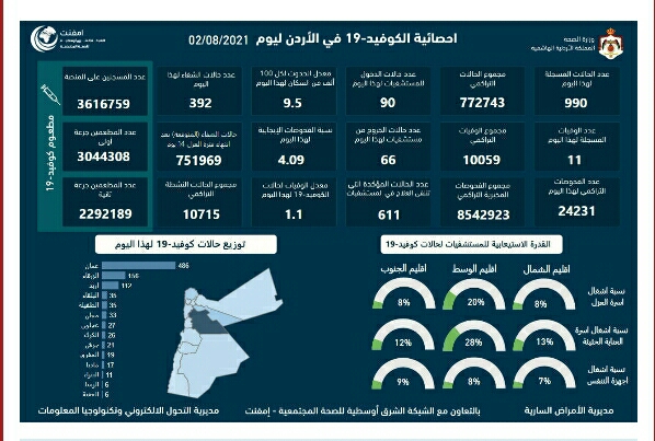 11 وفاة و990 إصابة جديدة بفيروس كورونا Last updated أغسطس 3, 2021 Share وهج نيوز : أعلنت وزارة الصحة الاثنين عن تسجيل 11 وفاة و990 إصابة جديدة بفيروس كورونا . Share FacebookTwitterGoogle+ReddItWhatsAppPinterestالبريد الإلكتروني