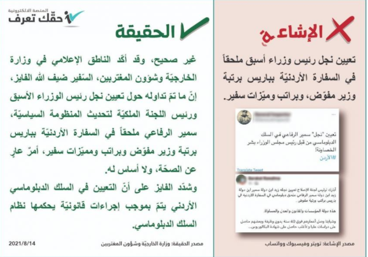 وأكد الناطق الاعلامي باسم وزارة الخارجية وشؤون المغتربين السفير ضيف الله الفايز، أن ما يتم تداوله حول تعيين نجل الرفاعي ملحقا بالسفارة الأردنية في باريس أمر عار عن الصحة ولا أساس له.