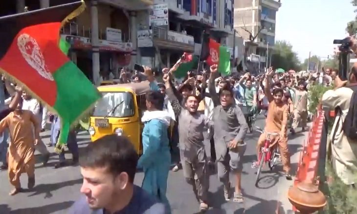 وأظهر مقطع مصور على مواقع التواصل الاجتماعي حشدا يضم رجالا ونساء يهتفون “علمنا هويتنا” وهم يلوحون بالعلم الوطني في يوم عيد الاستقلال الذي تحيي فيه أفغانستان كل عام في 19 أغسطس آب ذكرى استقلالها عن بريطانيا في 1919.
