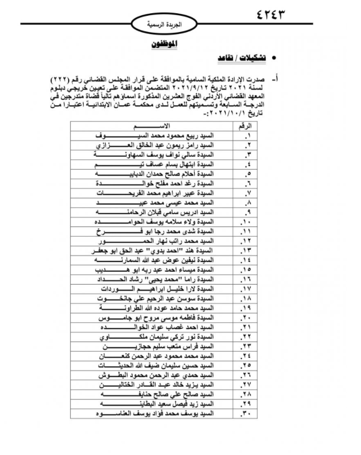وهج نيوز : صدر في عدد الجريدة الرسمية الخميس الارادة الملكية السامية بالموافقة على تعيين خريجي دبلوم المعهد القضائي الأردني التالية اسماؤهم قضاة متدرجين في الدرجة السابعة وتسميتهم للعمل لدى محكمة عمان الابتدائية.