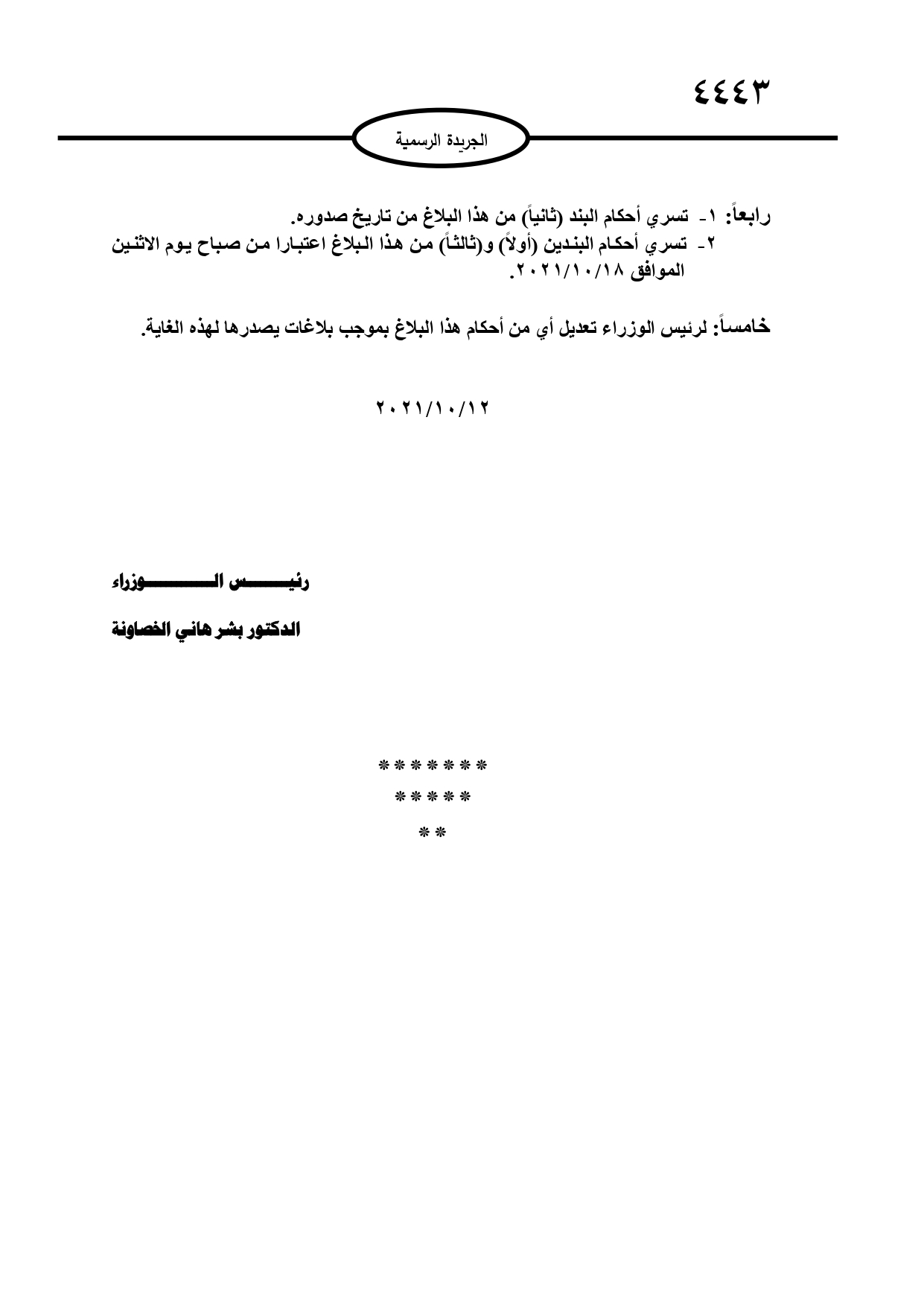 وهج 24 : اصدر رئيس الوزراء بشر الخصاونة، بلاغ رقم (46) من أمر الدفاع رقم (19).