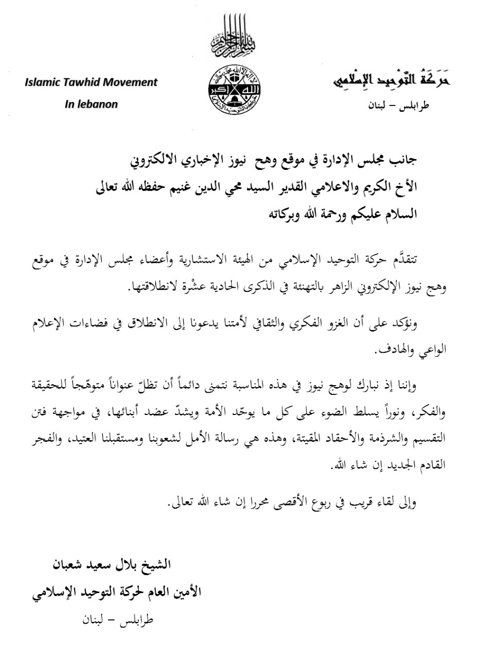 تتقدَّم حركة التوحيد الإسلامي من الهيئة الاستشارية وأعضاء مجلس الإدارة في موقع وهج نيوز الإلكتروني الزاهر بالتهنئة في الذكرى الحادية عشْرة لانطلاقتها.