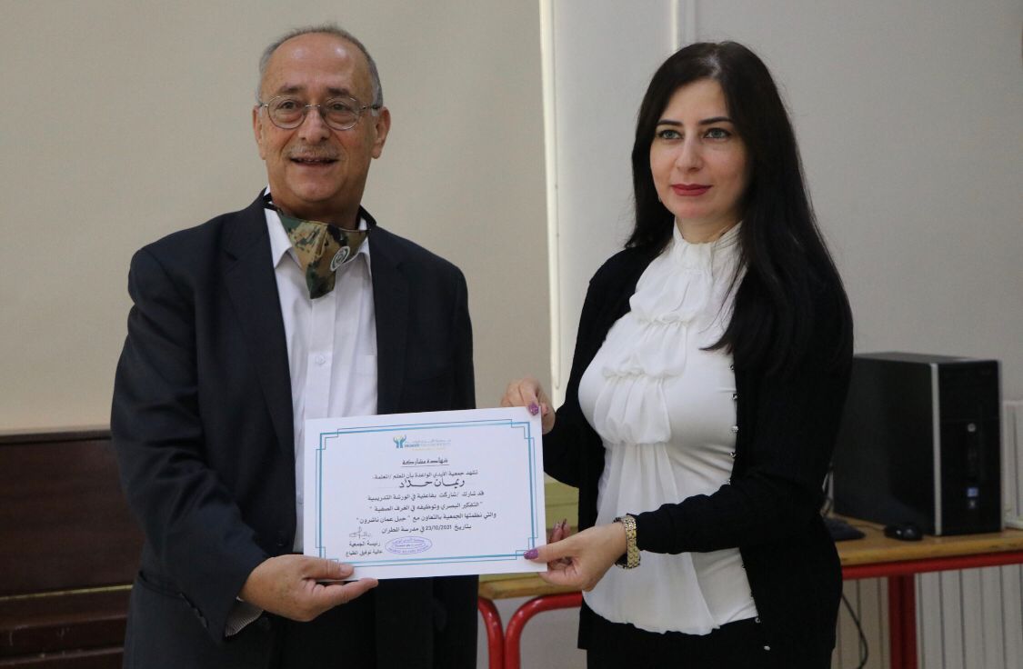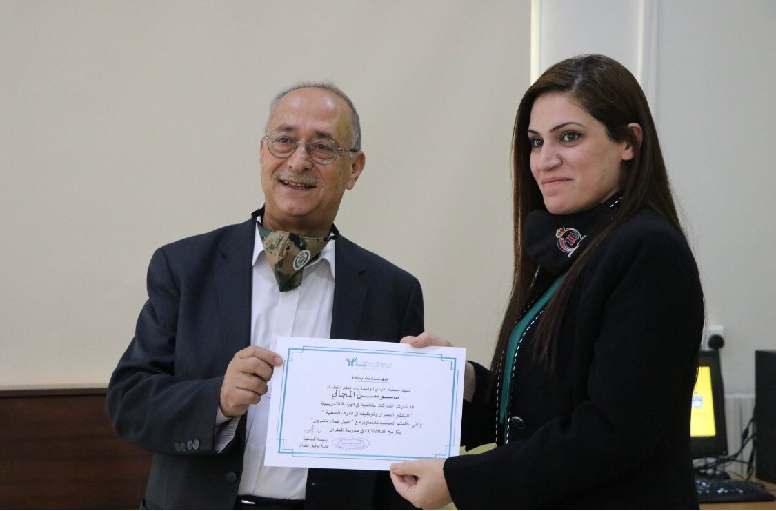 وفي نهايه الورشة؛ تم تكريم مقدم الورشة وتسليم الشهادات للمعلمين المشاركين.