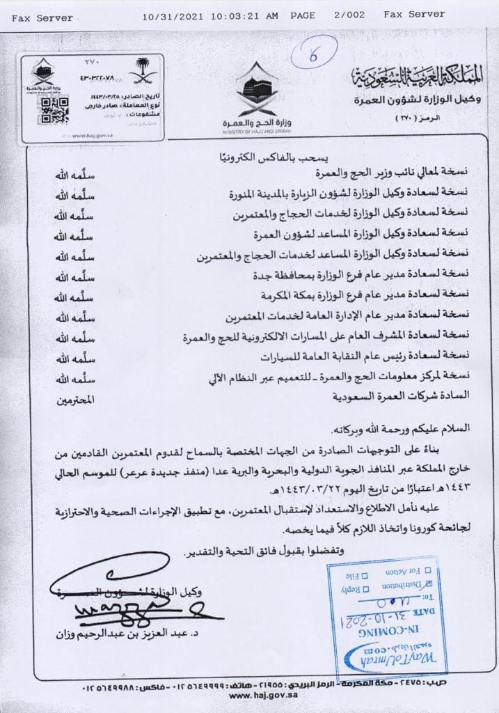 ونص التعميم، أنه يسمح للقادمين من خارج المملكة العربية السعودية، بأداء مناسك العمرة براً، باستثناء معبر عرعر الذي يربط السعودية بالعراق.