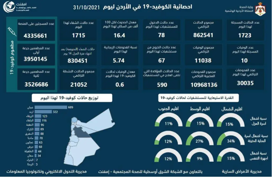 وأضاف، أن نسبة إشغال أسرّة العزل في إقليم الوسط بلغت 15 بالمئة، في حين وصلت نسبة إشغال أسرّة العناية الحثيثة في الإقليم ذاته إلى 27 بالمئة، ونسبة إشغال أجهزة التنفس الاصطناعي إلى 9 بالمئة.
