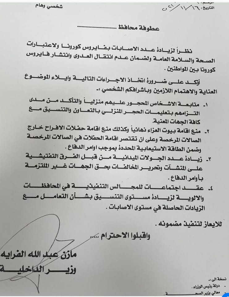 وكذلك وجهت الوزارة في كتاب وقعه وزير الداخلية مازن الفراية، بـ “متابعة الأشخاص المحجور عليهم منزليا والتأكد من مدى التزامهم بتعليمات الحجر المنزلي بالتعاون والتنسيق مع كافة الجهات المعنية”.