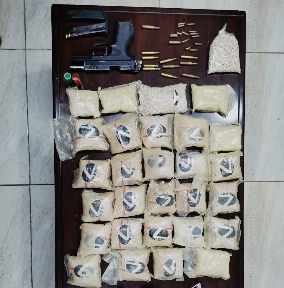 ** في قضية اخرى ضبط 30 الف حبة مخدرة وسلاح ناري بحوزة تاجر للمواد المخدرة في البادية الوسطى .