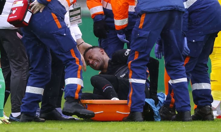 وحدث التواء لكاحل المهاجم البالغ عمره 29 عاما في الثواني الأخيرة من المباراة بعد دهسه ساق إيفان ماسو مدافع سانت إيتيين مما جعله يصرخ من الألم قبل نقله على محفة لخارج الملعب.