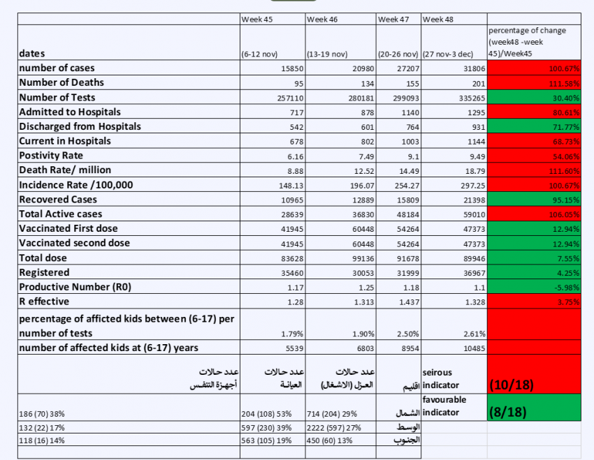 وأوضح مستشار رئيس هيئة الأركان المشتركة للشؤون الطبية عند دراسة وضع المطاعيم فان الأمر فيه الكثير من التناقضات ففي اللحظة التي كانت فيها الزيادة في مجموع الجرعات والمسجلين متواضعة بين 7.55 و4.25، نجد زيادة متدنية ولكنها مقبولة في الجرعة الأولى والجرعة الثانية 12.94 و 13 بالمئة، ولكن الأهم أن نسبة الزيادة فيمن تلقى الجرعة الثانية في الفئة المستهدفة هي فقط 4 بالمئة على مدى أربعة أسابيع، فهي الآن 57.9 بالمئة حيث كانت 53 بالمئة مما يجعل الوصول الى النسبة الآمنة وهي 75 بالمئة يحتاج الى فترة طويلة، مبيناً أن الاجراءات الجديدة قد تساهم بتسريع ذلك لتلافي الزيادة في الفئة المستهدفة سواء لمن يحتاج الجرعة المعززة أو من وافق ممن هو في الفئة العمرية 12 إلى 17 على التطعيم.