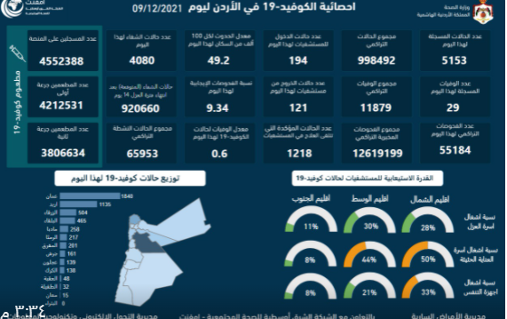 وهج 24 : أعلنت وزارة الصحة، اليوم الخميس، عن تسجيل 29 وفاة و5153 إصابة جديدة بفيروس كورونا في المملكة، ليرتفع العدد الإجمالي إلى 11879 وفاة و998492 إصابة.