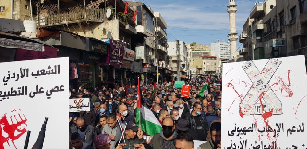 وحذر المشاركون في المسيرة من خطورة المضي قدما في العلاقات مع الاحتلال، لما في ذلك من آثار وخيمة على الأردن اقتصاديا وسياسيا، وعلى القضية الفلسطينية، ومحوريتها.
