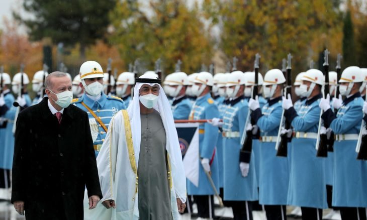 وفي الوقت نفسه كان مسار الحرب في ليبيا يتغير ضدها، فقد أرسلت أسلحة ومقاتلات بل ومستشارين عسكريين لدعم أمير الحرب هناك، خليفة حفتر. وخاضت تلك الحرب ضد الإسلاميين الذين قالت إن لهم تأثير على حكومة طرابلس. لكن حفتر أثبت أنه حليف خطير حيث شن هجوما على العاصمة طرابلس وأجبر على التراجع من قبل قوات الحكومة وبدعم من تركيا. وفي الأشهر الأخيرة وجدت الإمارات نفسها تدعم جهود السلام وأصلحت العلاقات مع تركيا رغم تعاطفها مع الإخوان المسلمين. وكانت ثمار عمليات التقارب زيارة وزير الخارجية التركي تشاوش مولود أوغلو إلى الإمارات يوم الثلاثاء. واتهمت تركيا أبو ظبي بدعم انقلاب عام 2016 الفاشل، لكنها ترغب باستثمارات الخليج لدعم اقتصادها الذي يتداعى، وتشعر الإمارات أن هذا يتناسب مع قوتها التقليدية.