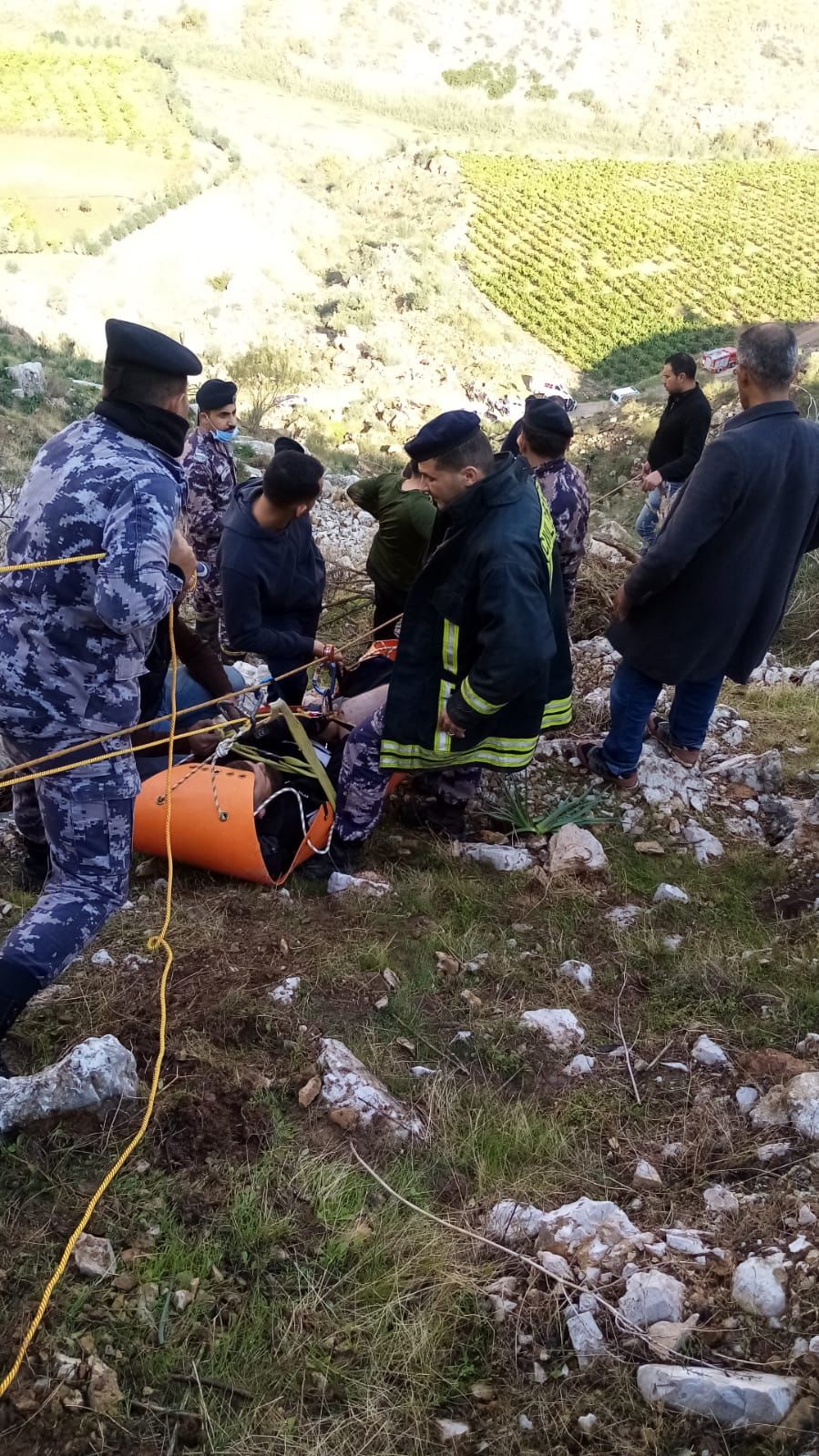 ** فرق الدفاع المدني تنقذ مواطنا سقط من مقطع صخري بعد ساعات عمل متواصلة.