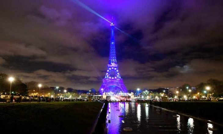 وفي خطوة ترمز إلى هذا الانتقال أنير برج إيفل وقصر الإليزيه باللون الأزرق الأوروبي.