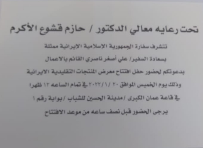 الشرق الأوسط نيوز : تتشرف سفارة الجمهوريه الإسلاميه الإيرانيه ممثله بسعاده السفير علي اصغر ناصري القائم بالأعمال بدعوتكم لحضور حفل افتتاح معرض المنتجات التقليدية الإيرانيه وذلك يوم الخميس الموافق ٢٠٢٢/٠١/٢٠ في تمام الساعه ١٢ ظهرا في قاعة عمان الكبرى مدينه الحسين للشباب بوابه رقم ١ ويرجى الحضور قبل بنصف ساعه من موعد الافتتاح .