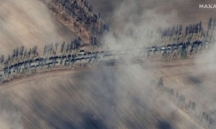 وتبرز صور الأقمار الاصطناعية كيف توافدت مختلف المدرعات والدبابات وشاحنات خاصة بالدعم اللوجيستي مثل نقل الجنود والذخيرة والمواد الغذائية والطبية لتصل الى قافلة مكونة من ستين كلم من الشمال نحو العاصمة كييف، حيث أصبحت على بعد أقل 20 كلم من العاصمة وبالقرب من مطار أنطونوف.