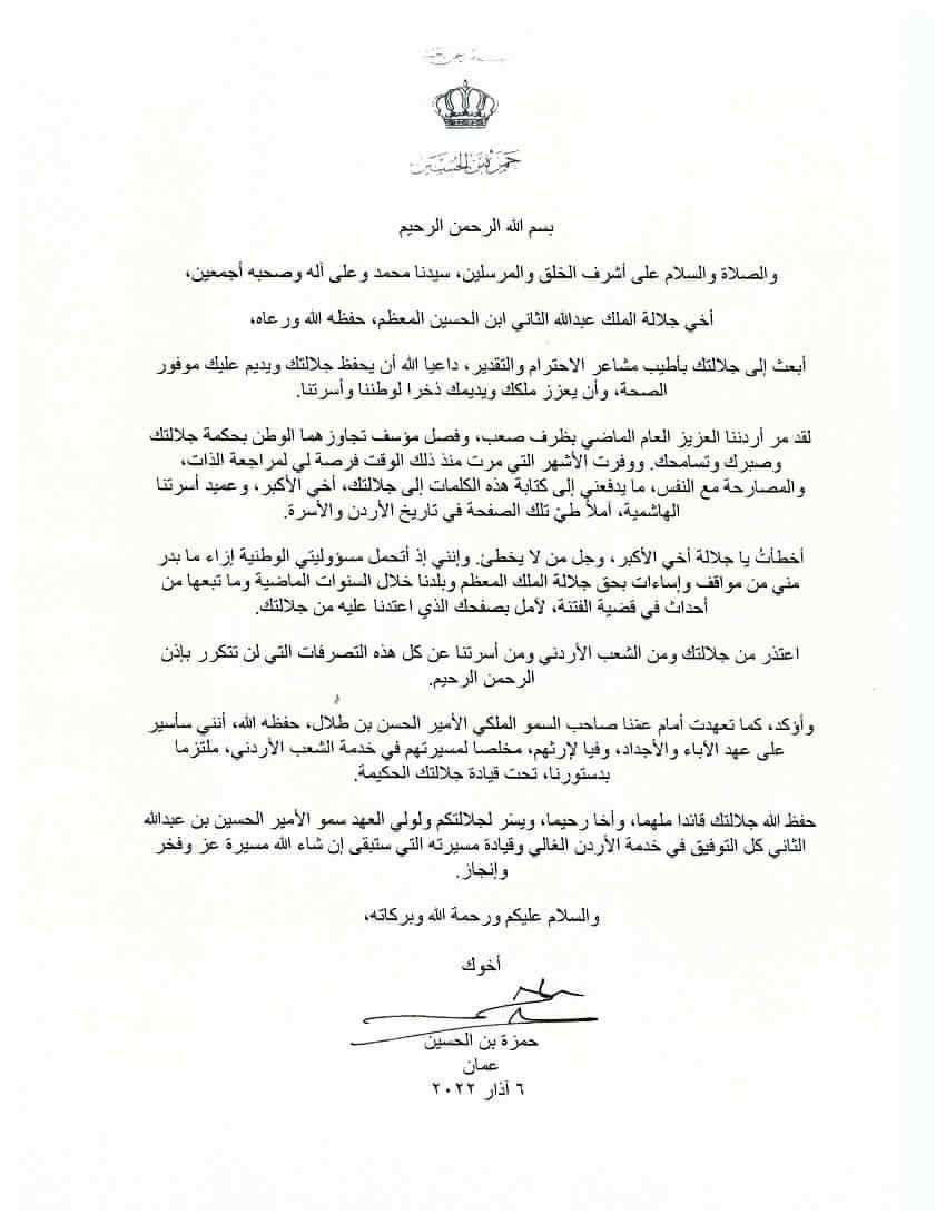 الشرق الأوسط نيوز : “أقر بخطئي”.. هي العبارة الأهم في رسالة مثيرة وجهها ولي العهد الأردني الأسبق حمزة بن الحسين لأخيه الملك عبدالله الثاني، في خطوة ستعني الكثير لاحقا ضمن سيناريو متصاعد لإغلاق ملف ما سمي بـ”الفتنة” في المملكة.