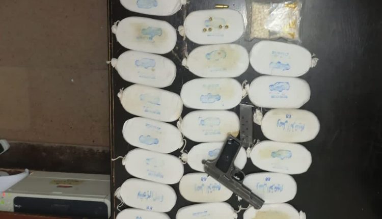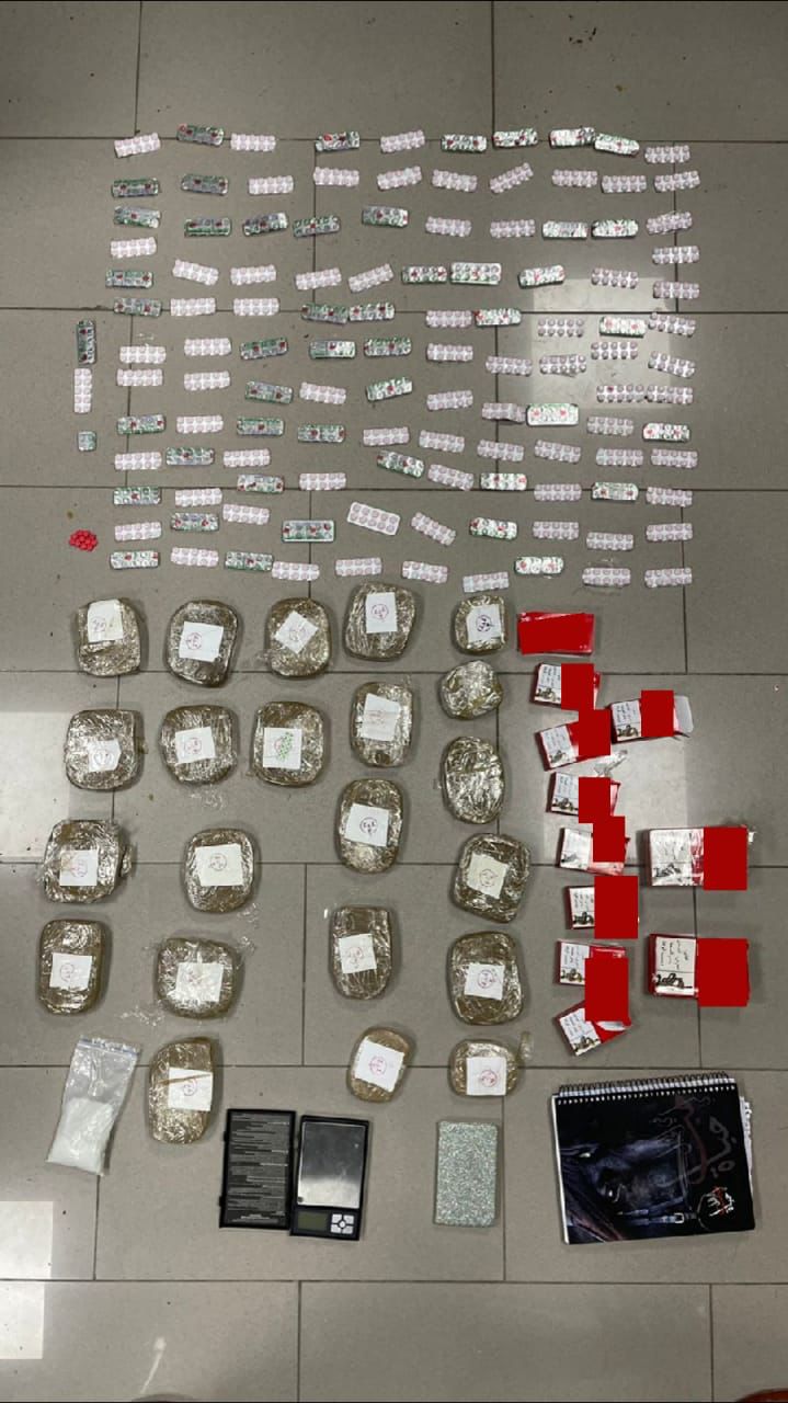 وفي القضية الثانية فقد أُلقي القبض على أحد تجار ومروجي المواد المخدرة في إحدى مناطق البادية الشمالية وضبط بحوزته ٣٥ كفاً من مادة الحشيش المخدرة و١٢ الف حبة كبتاجون .