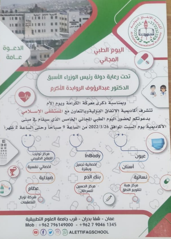 الشرق الأوسط نيوز – من عمان – محيي الدين غنيم : برعاية دولة رئيس الوزراء الأسبق الدكتور عبدالرؤوف الروابدة الأكرم، تقيم مدارس الإتفاق في شفابدران، يوم طبي مجاني ولكافة التخصصات الطبية وبنك دم متكامل