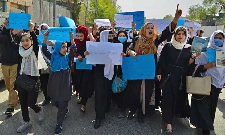 ونشرت وسائل إعلام محلية لقطات فيديو لبضع عشرات من النساء مع فتيات يرتدين الزي المدرسي ويحملن كتبا مدرسية، يطالبن بحقوقهن في الدراسة والعمل في أفغانستان ويردن إعادة فتح مدارس البنات بجميع أنحاء البلاد.