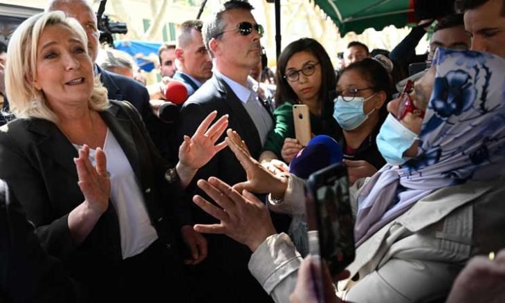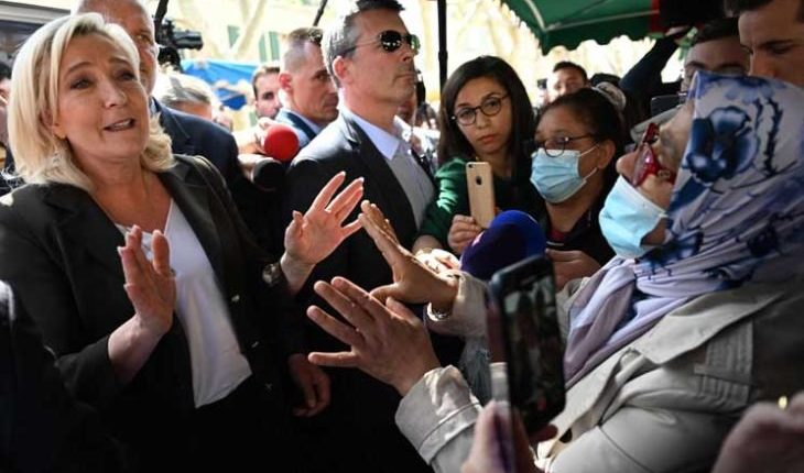 في مواجهة امرأة محجبة، خلال الزيارة الميدانية التي قادتها الجمعة إلى أحد أسواق Le Vaucluse في منطقة “بروفانس-آلب-كوت-دازير”، ظلت مارين لوبان على موقفها من دون أن ترغب في إطالة التبادل أكثر من اللازم.