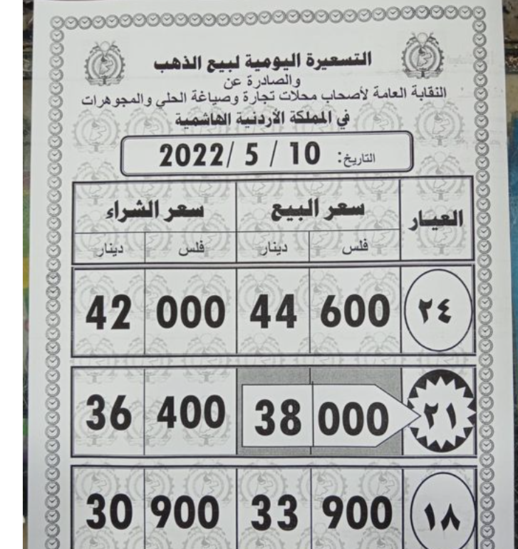 ووفق نقابة أصحاب محلات تجارة وصياغة الحلي والمجوهرات، فقد بلغ سعر بيع غرام الذهب عيار 21 الأكثر رغبة من الأردنيين بالسوق المحلية عند 38,00 دينارا لغايات شراء المواطنين من محلات الصاغة.