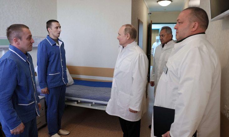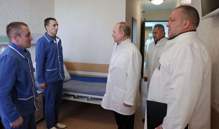 قبلها، ظهر بوتين في مشاهد بثها التلفزيون الروسي برداء طبي أبيض، متحدثاً مع عدد من الجنود بشأن بلداتهم وأوضاعهم العائلية. وكان الجنود يقفون بالقرب من أسرتهم ولم تظهر إصاباتهم.