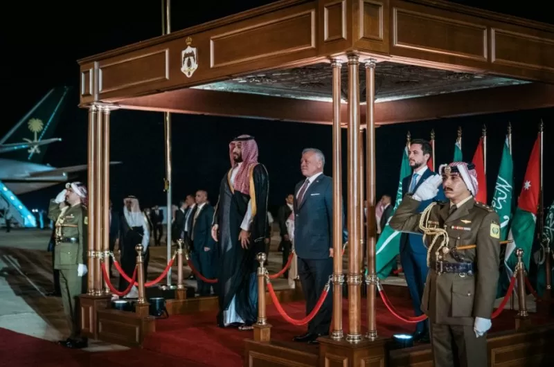 الشرق الأوسط نيوز : ودع جلالة الملك عبدالله الثاني وسمو الأمير الحسين بن عبدالله الثاني ولي العهد، في مطار الملكة علياء الدولي، اليوم الأربعاء، سمو الأمير محمد بن سلمان بن عبدالعزيز آل سعود ولي العهد، نائب رئيس مجلس الوزراء، وزير الدفاع في المملكة العربية السعودية، الذي اختتم زيارة رسمية إلى المملكة استمرت يومين.