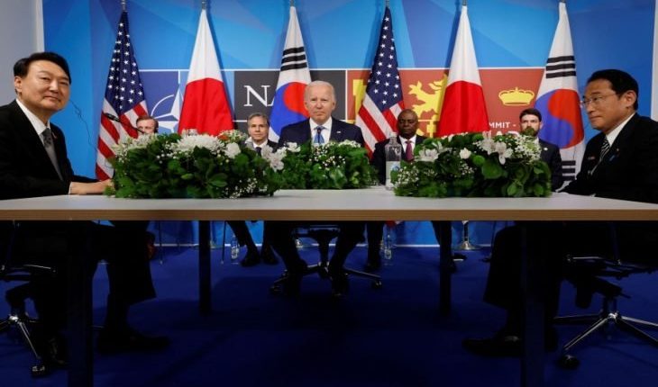 التقى قادة الولايات المتحدة وكوريا الجنوبية واليابان على هامش قمة حلف شمال الأطلسي الأسبوع الماضي واتفقوا على استكشاف المزيد من الوسائل لتعزيز “الردع الموسع” ضد كوريا الشمالية.