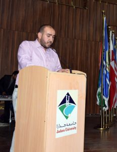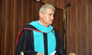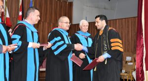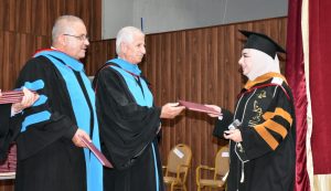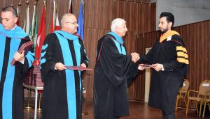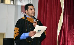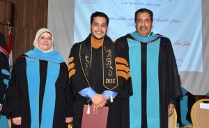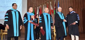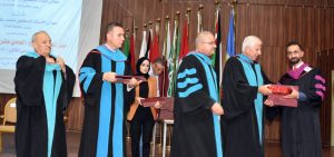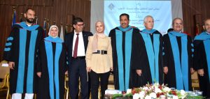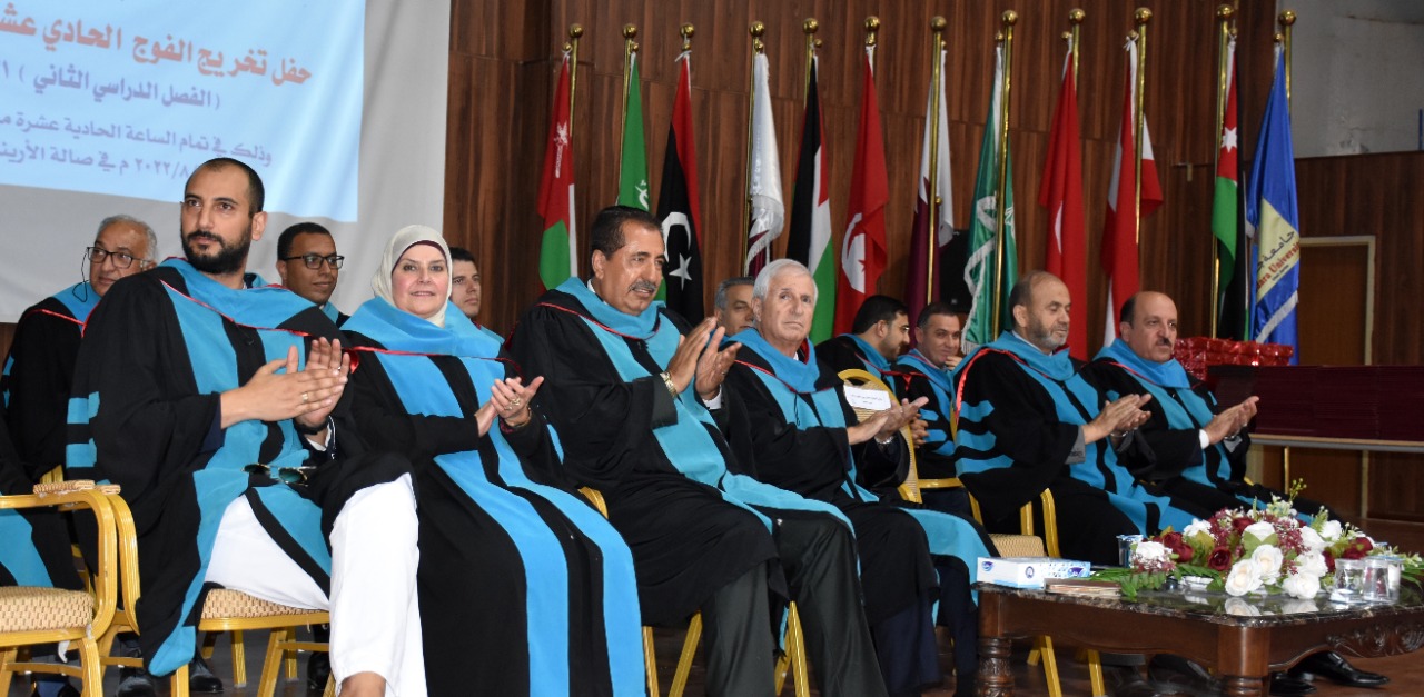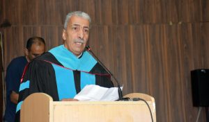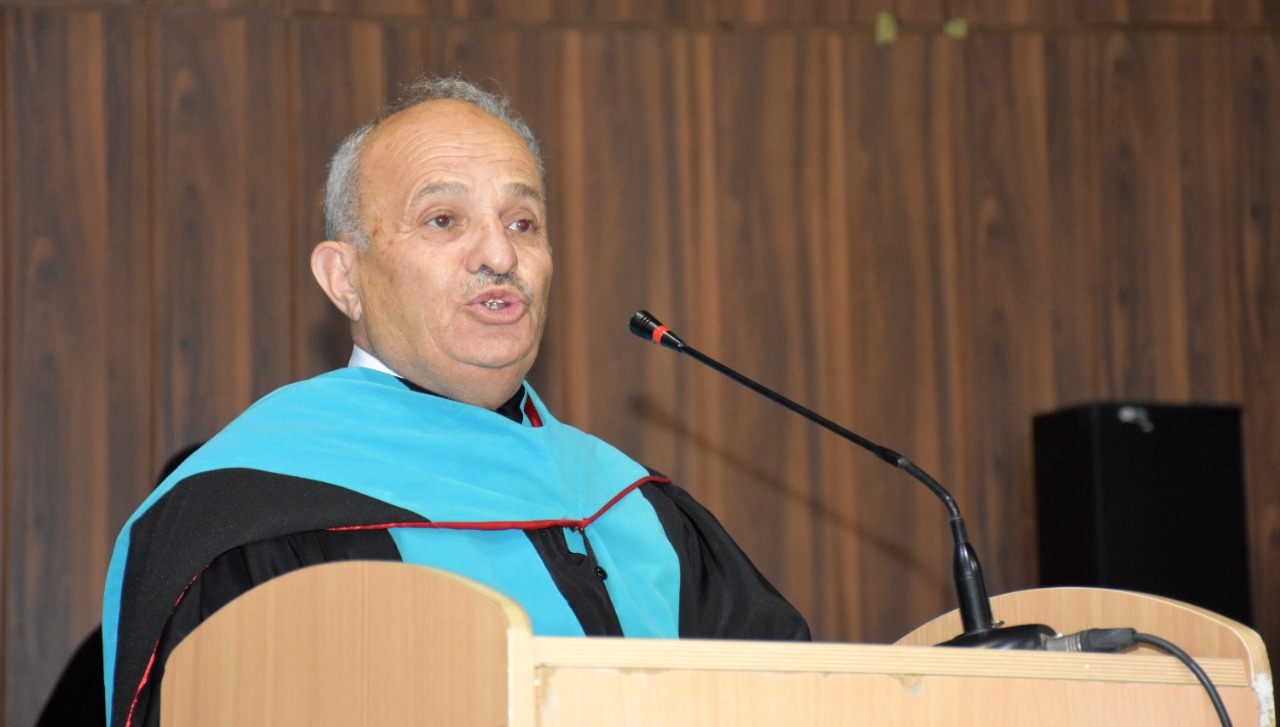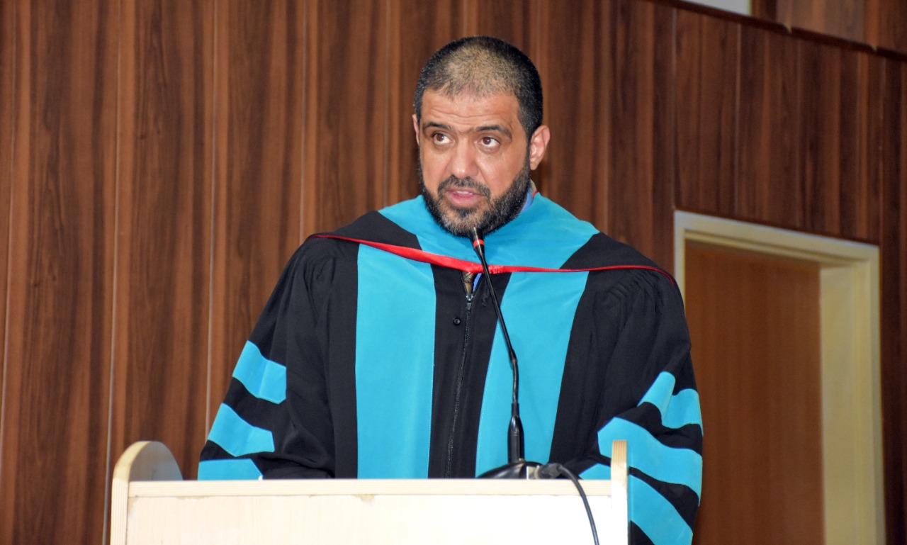 وبارك لزملائه الخريجين حيث قال لهم أنتم سفراء الجامعة، وأوصاهم بان يحفظوا الود لأستاذهم وأن يبقوا عند حسن ظنهم بهم، ودعاهم إلى البر بوالديهم وودهم ورسم البسمة على شفاههم بتفوقهم ونجاحهم.