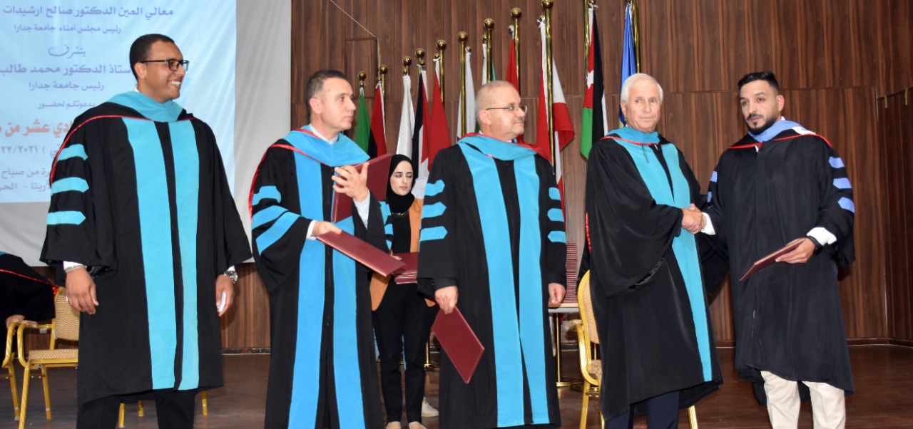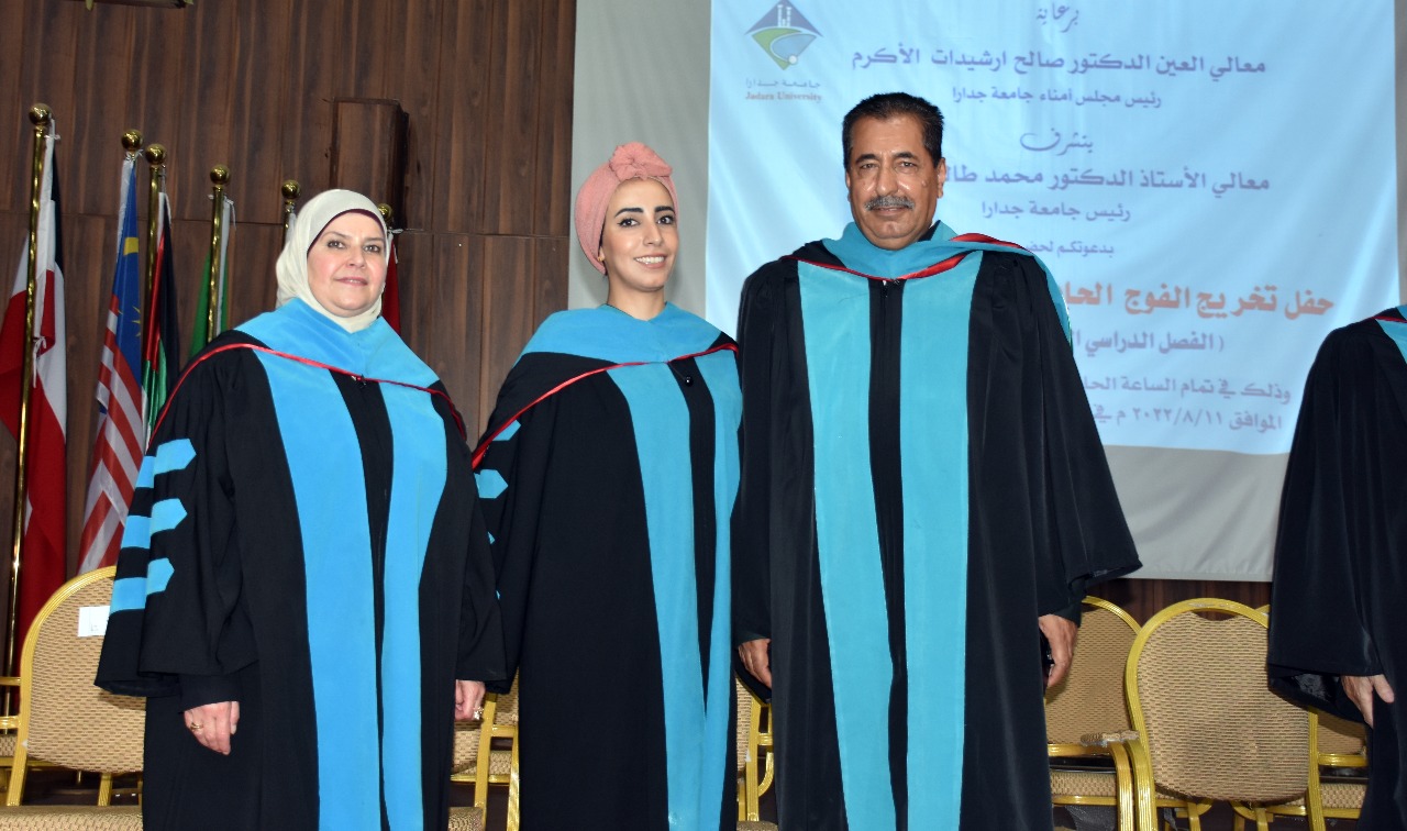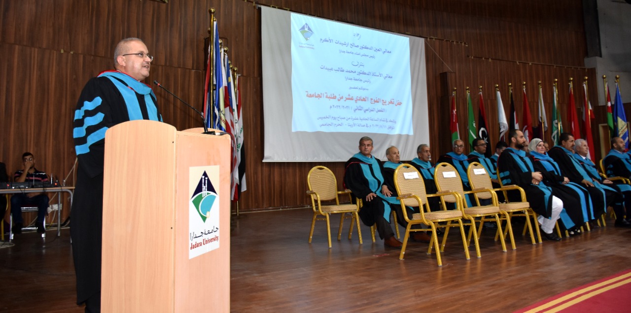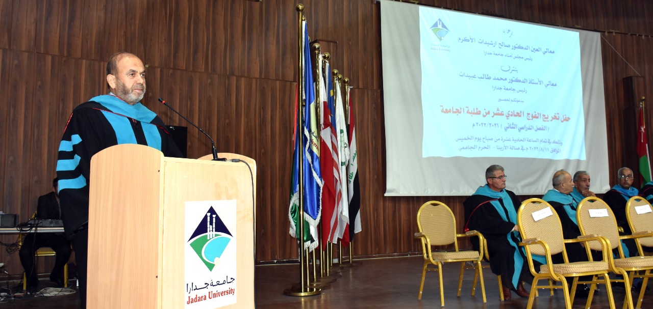 وبارك راعي الحفل للخريجين وذويهم هذا الفرح الذي يعد من أيام الوطن ومن أيام جامعة جدارا وتأكيدًا لمسيرتها العلمية الناصعة، محققين إنجازاتهم وأهدافهم العلمية بعد رحلة دراسية غير مسبوقة وضمن ظروف صحية صعبة المت بالوطن كله وخلقت عدة تحديات لكل الوطن وأثرت في حياة كل واحد فينا ولكن قوة الإرادة وهمة الإنجاز كانت أقوى من كل وباء.