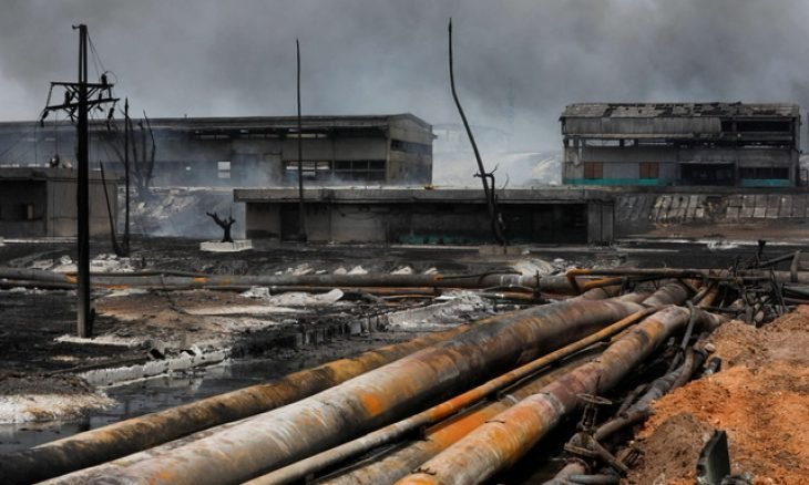 واحترقت أربعة خزانات يمكن أن تحوي ما يصل إلى 52 مليون لتر من النفط الخام أو المازوت، من أصل ثمانية موجودة في الموقع.