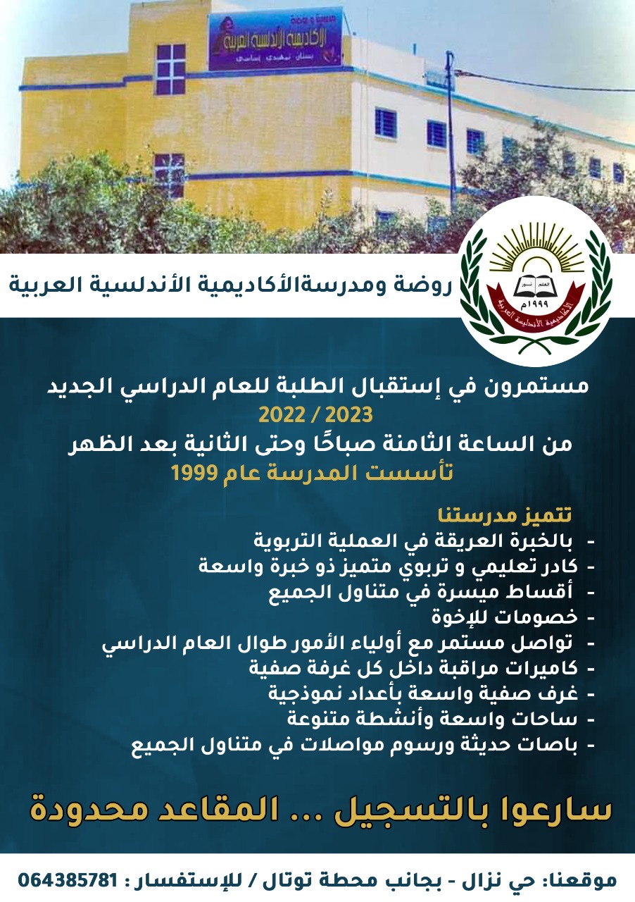 روضة ومدرسة الأكاديمية الأندلسية العربية تعلن عن إستمرار تسجيل الطلبة