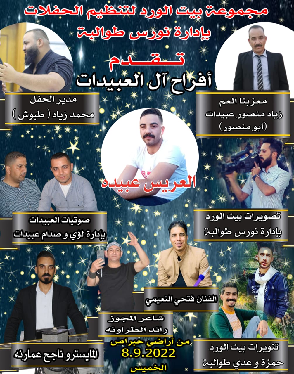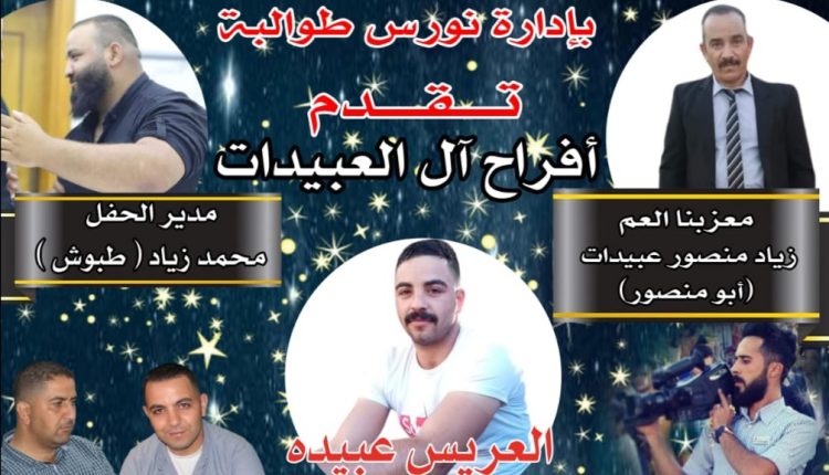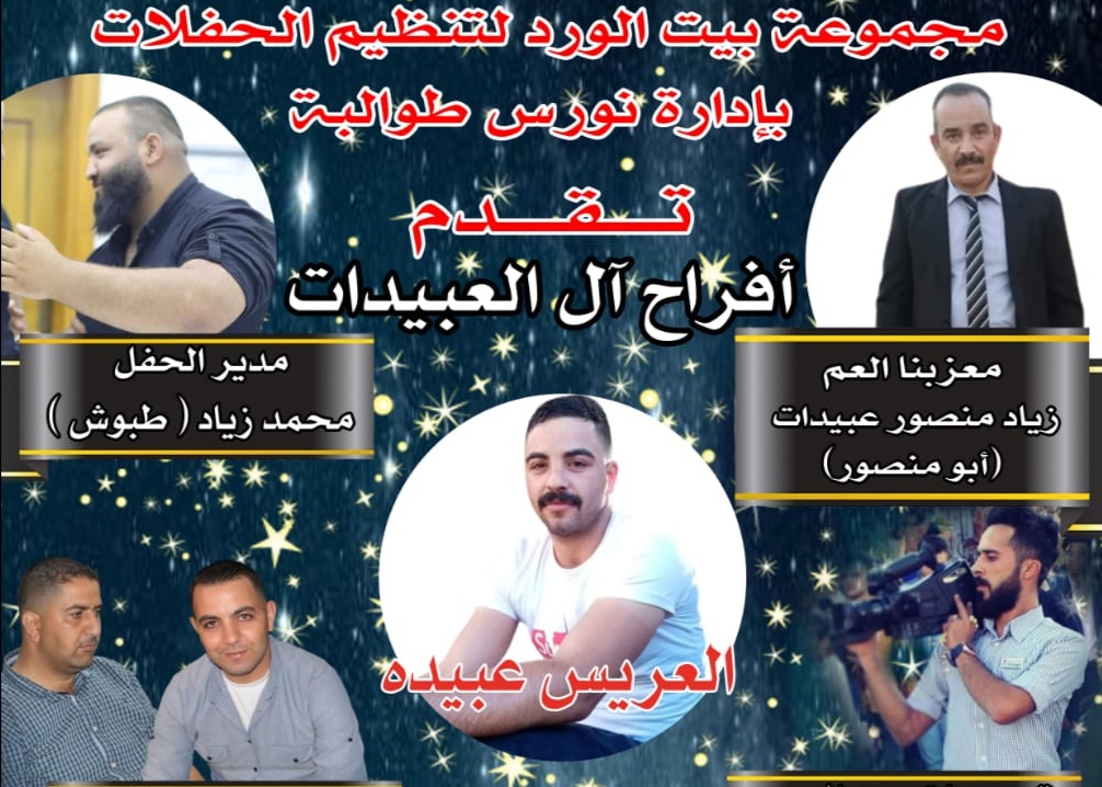 ممثلا برئيسه الاستاذ عرفات سالم الخطيب وكافة كوادره واعضائه أسمى آيات التهاني والتبريكات للشيخ زياد عبيدات ابو منصور بمناسبة زفاف ولده عبيده زياد عبيدات دمتم ودامت افراحكم وبيوتكم بالعطاء والمحبة والخير . الدعوة عامه