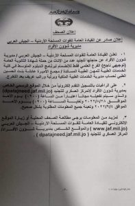 ولمزيـد مـن المعلومات زيارة الموقع الإلكترونـي للقيـادة العامـة للقـوات المسلحة الأردنيـة – الجـيش الـعربـي (www.jaf.mil.jo ) والموقـع الخـاص بمديريـة شـؤون الأفــراد المركز العسكري للتجنيد ( dpatajneed.jaf.mil.jo ) .