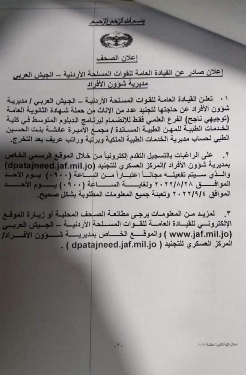 وعلى الراغبات بالتسجيل التقدم إلكترونياً من خلال الموقع الرسمي الخاص بمديرية شؤون الأفراد /المركز العسكري للتجنيد (dpatajneed.jaf.mil.jo) والـذي سيتم تفعيلـه مجـانـا اعتبـاراً مـن السـاعة (٠٩٠٠) يـوم الأحـد الموافـق ۲۰۲۲/۸/۲۸ ولغايـة السـ ساعة (٠٩٠٠) يـوم الأحـد الموافق ٢٠٢٢/٩/٤ وتعبئة جميع المعلومات المطلوبة بشكل صحيح.