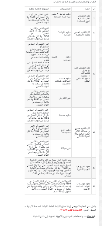 الشرق الأوسط نيوز : تعلن القيادة العامة للقوات المسلحة الأردنية – الجيش العربي / مديرية شؤون الأفراد عن حاجتها لتجنيد عدد من الذكور (فقط) من حملة شهادة الدراسة الثانوية العامة (ناجح)، وذلك لحساب كليات المجتمع ضمن برنامج الدبلوم الشامل والبرنامج الفني وبشروط معينة لهذا العام 2022.