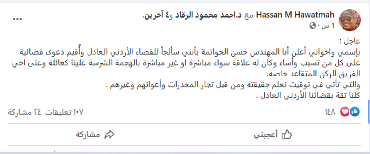 وفي وقت سابق توعد المهندس حسن الحواتمة شقيق مدير الأمن العام السابق الفريق المتقاعد حسين الحواتمة من خلال منشور له على صفحته عبر “فيسبوك” بملاحقة من يقف وراء ما اسماه بالهجمة الشرسة على عائلة الحواتمة بشكل عام والفريق الحواتمة بشكل خاص قانونيا ومن خلال اللجوء إلى القضاء.