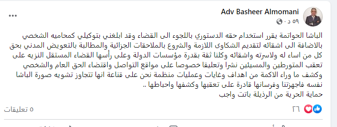 وقال المومني في منشور عبر موقع التواصل الاجتماعي “فيس بوك” ان القضاء المستقل النزيه قادر على تعقب المتورطين والمسيئين نشرا وتعليقا.