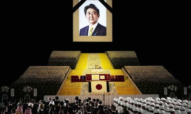 بدأت المراسم في الساعة الثانية بعد الظهر بالتوقيت المحلي (05:00 بتوقيت غرينتش)، حيث حملت أرملته آكي رماد آبي إلى قاعة نيبون بودوكان بوسط طوكيو لتنطلق أنغام الموسيقى من فرقة عسكرية وتدوي طلقات تحية حرس الشرف.