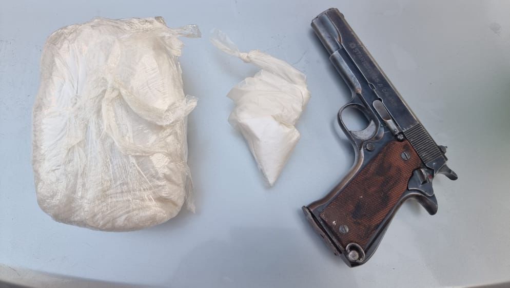 **إلقاء القبض عليهما وإصابة أحدهما بمنطقة الفخذ وبحوزتهما كيلو غرام وربع من مادة الكريستال المخدرة والسلاح الناري المستخدم .