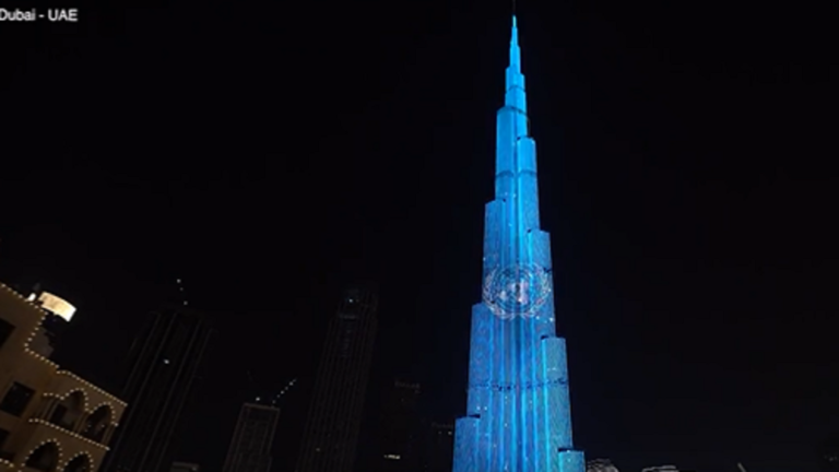 شبكة الشرق الأوسط نيوز : أضيء كل من مبنى أدنوك في العاصمة الإماراتية أبوظبي وبرج خليفة في مدينة دبي، باللون الأزرق، وذلك بمناسبة اليوم العالمي للأمم المتحدة.