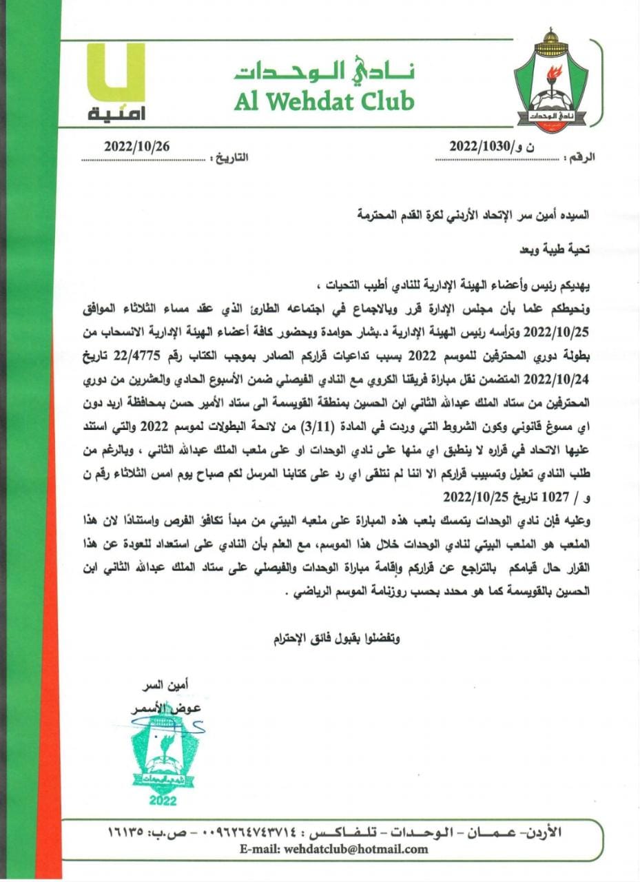 الوحدات ينسحب رسميا من الدوري.. وثيقة