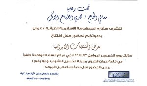 تهدي سفارة الجمهورية الإسلامية الإيرانية في عمان أطيب تحياتها لكم و نرفق لكم دعوه بخصوص المشاركة في معرض المنتجات الإيرانية وذلك غداً يوم الخميس الموافق 03-11-2022 في تمام الساعه الواحده ظهراً في قاعة عمان الكبرى مدينة الحسين للشباب بوابة رقم 1.