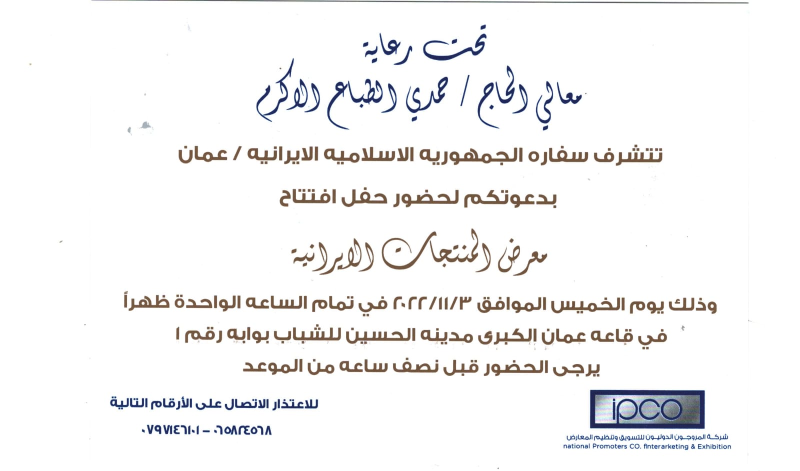 شبكة الشرق الأوسط نيوز – من عمان – محيي الدين غنيم : وجهت سفارة الجمهورية الإسلامية الإيرانية في عمان دعوات لحضور حفل إفتتاح ” معرض النتجات الإيرانية ” تحت رعاية معالي الحاج حمدي الطباع الأكرم ، وذلك يوم الخميس الموافق 3/11/2022 تمام الساعة الواحدة ظهراً في قاعة عمان الكبرى – مدينة الحسين للشباب بوابة رقم 1.