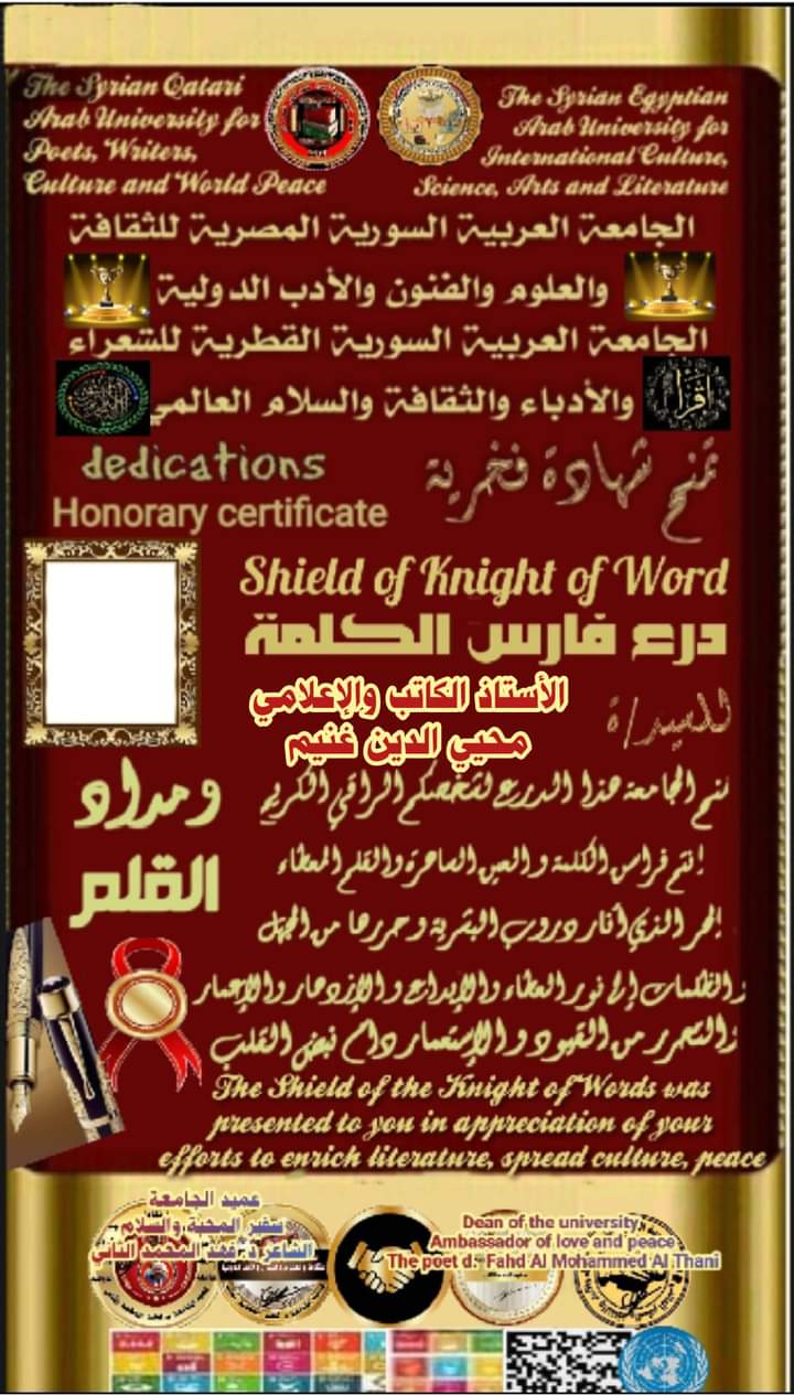 *ورئيس الجامعة العربية السورية القطرية للشعراء والأدباء والثقافة والسلام العالمي وأعضاء الهيئة الإدارية والمشرفين إتخذ قرار وبتنسيب من الأستاذ الكاتب والإعلامي أحمد إبراهيم أحمد ابو السباع القيسي بمنح الأستاذ الكاتب والإعلامي محيي الدين غنيم شهادة فخرية عليا تكريما لعطائه وإبداعه وتميزه الدائم بمقالاته في صحيفته وموقعه الموقر شبكة الشرق الأوسط نيوز …*