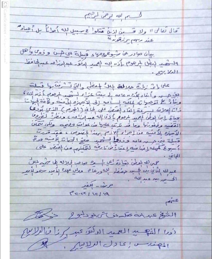 قبيلة بني حسن تمدد مهلة القبض على قاتل الشهيد الدلابيح اسبوعا