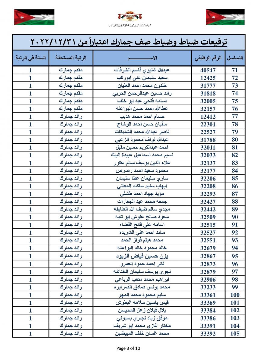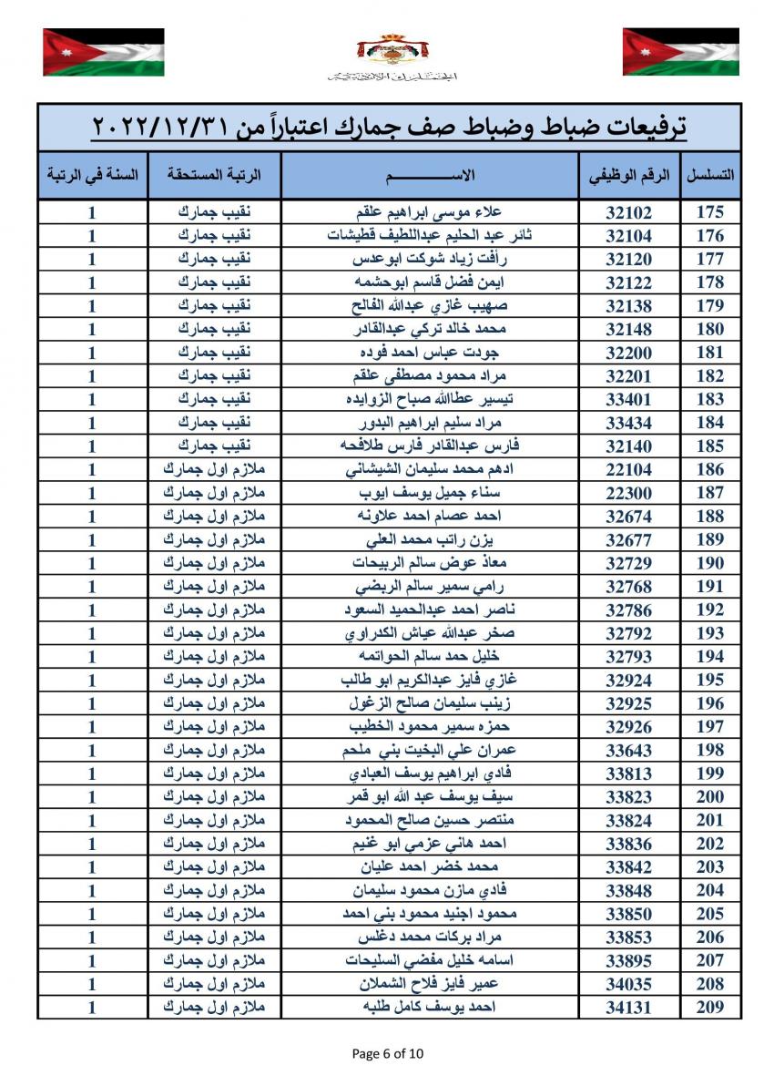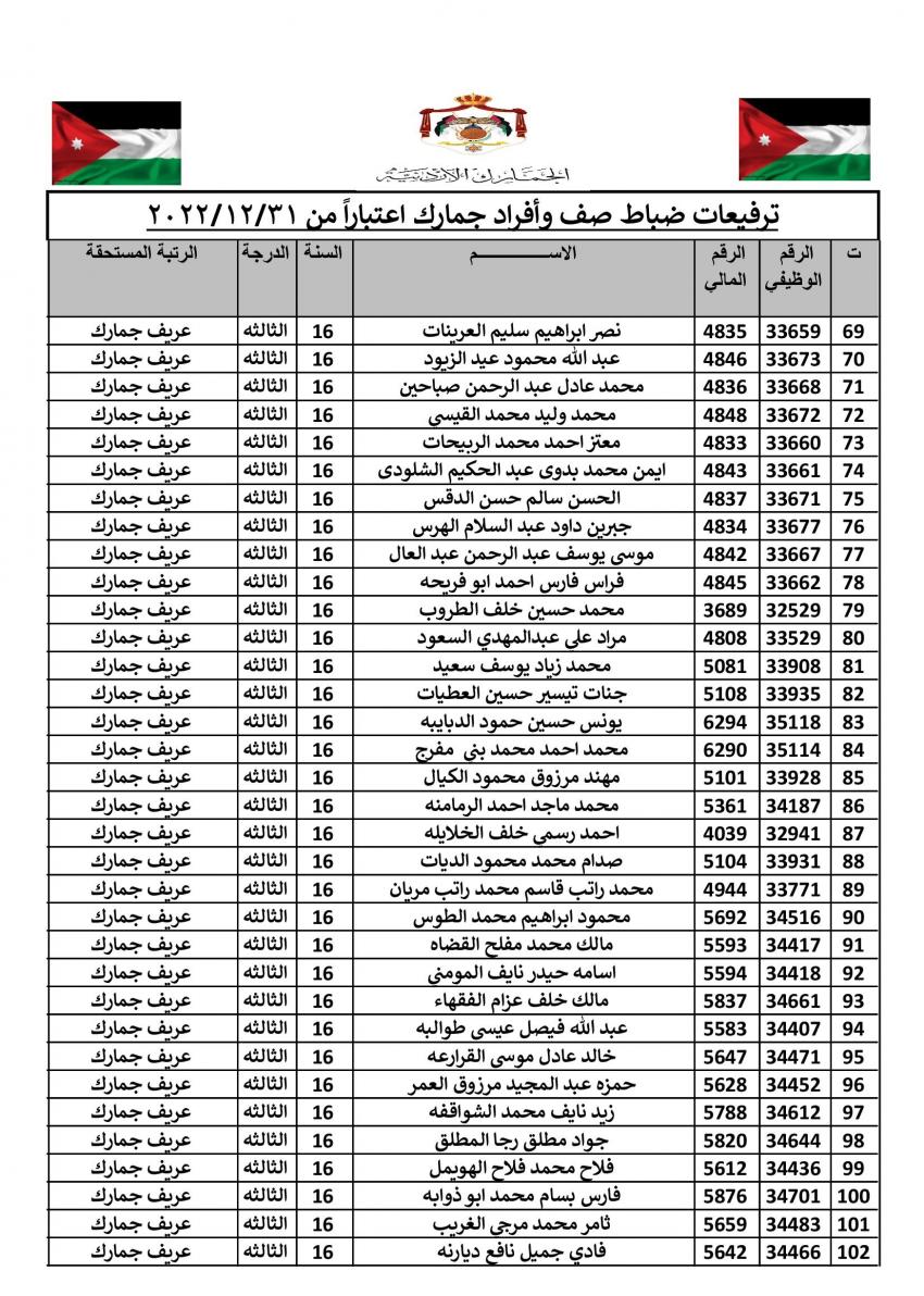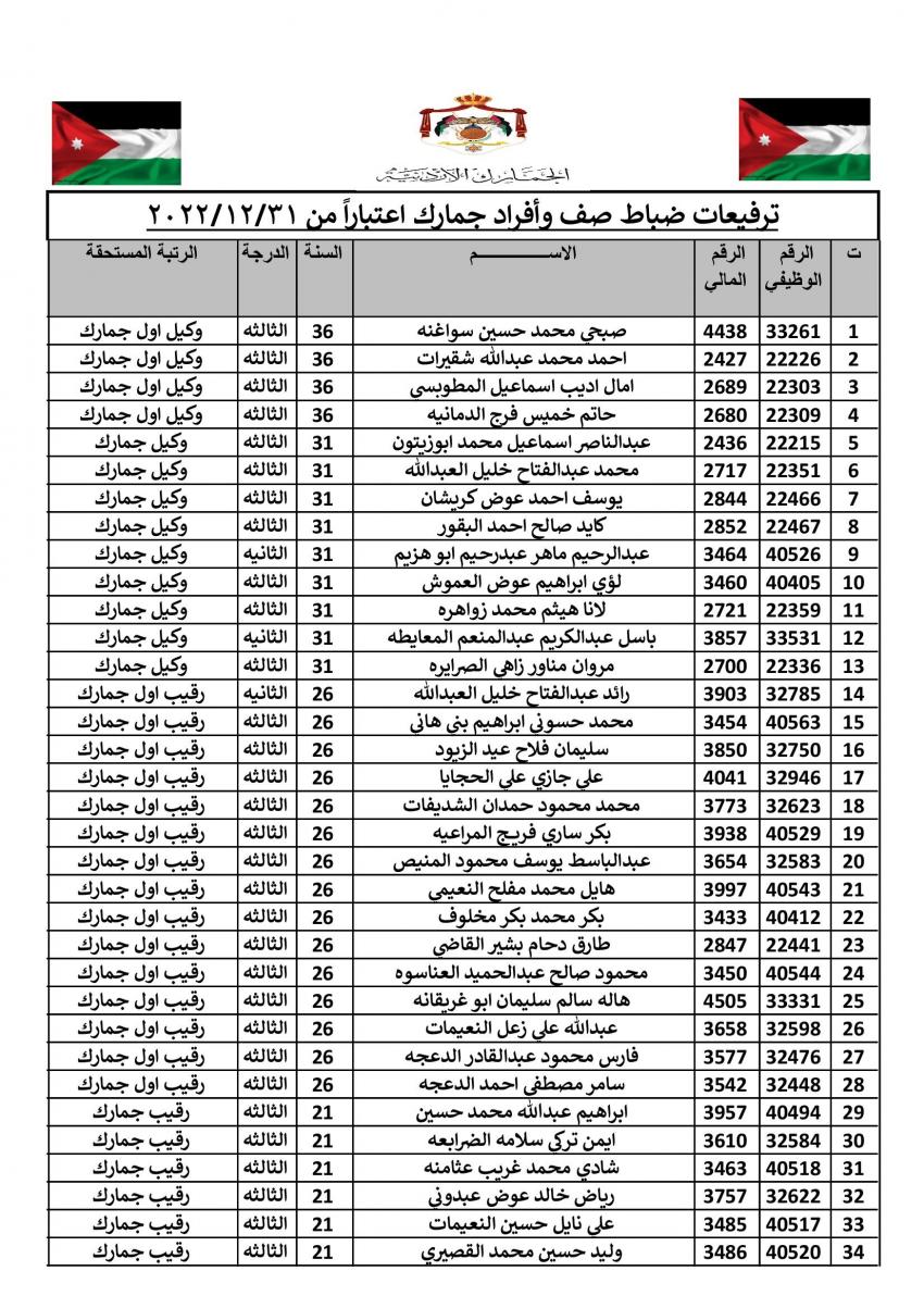 وتقدم مدير عام الجمارك الأردنية جلال القضاة بالتهنئة والتبريك الى الزميلات والزملاء الذين تم ترفيعهم الى الرتب والدرجات المبينة إزاء اسم كل منهم.