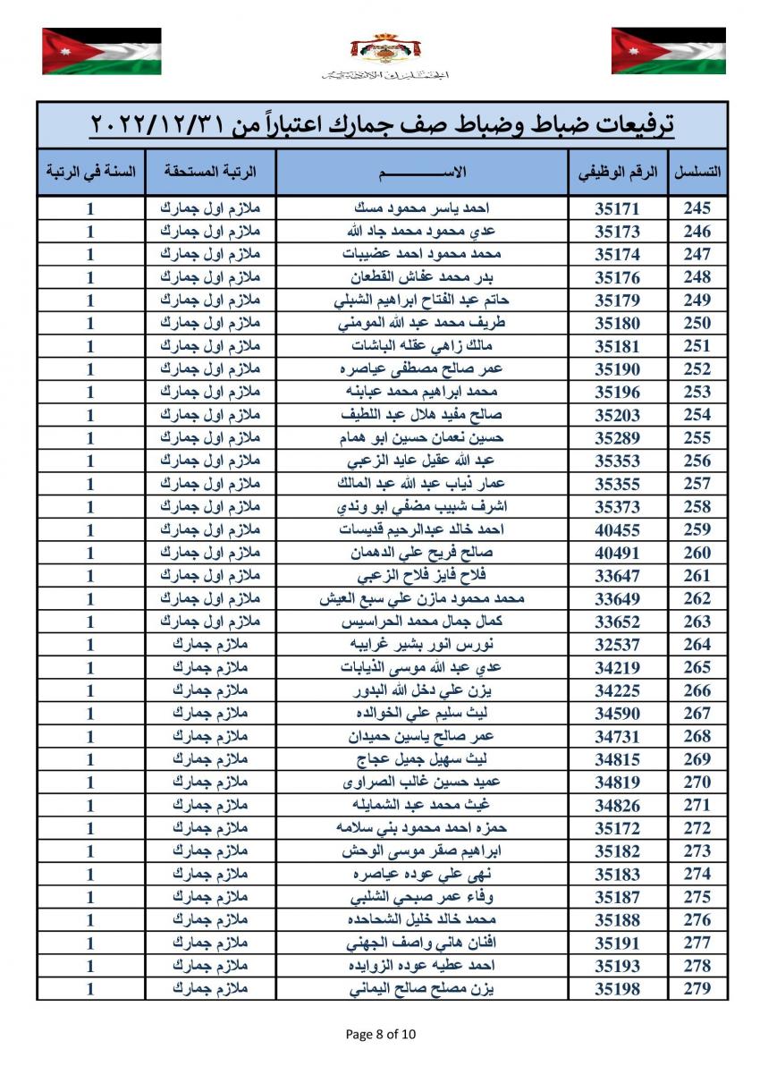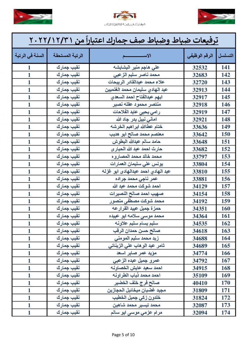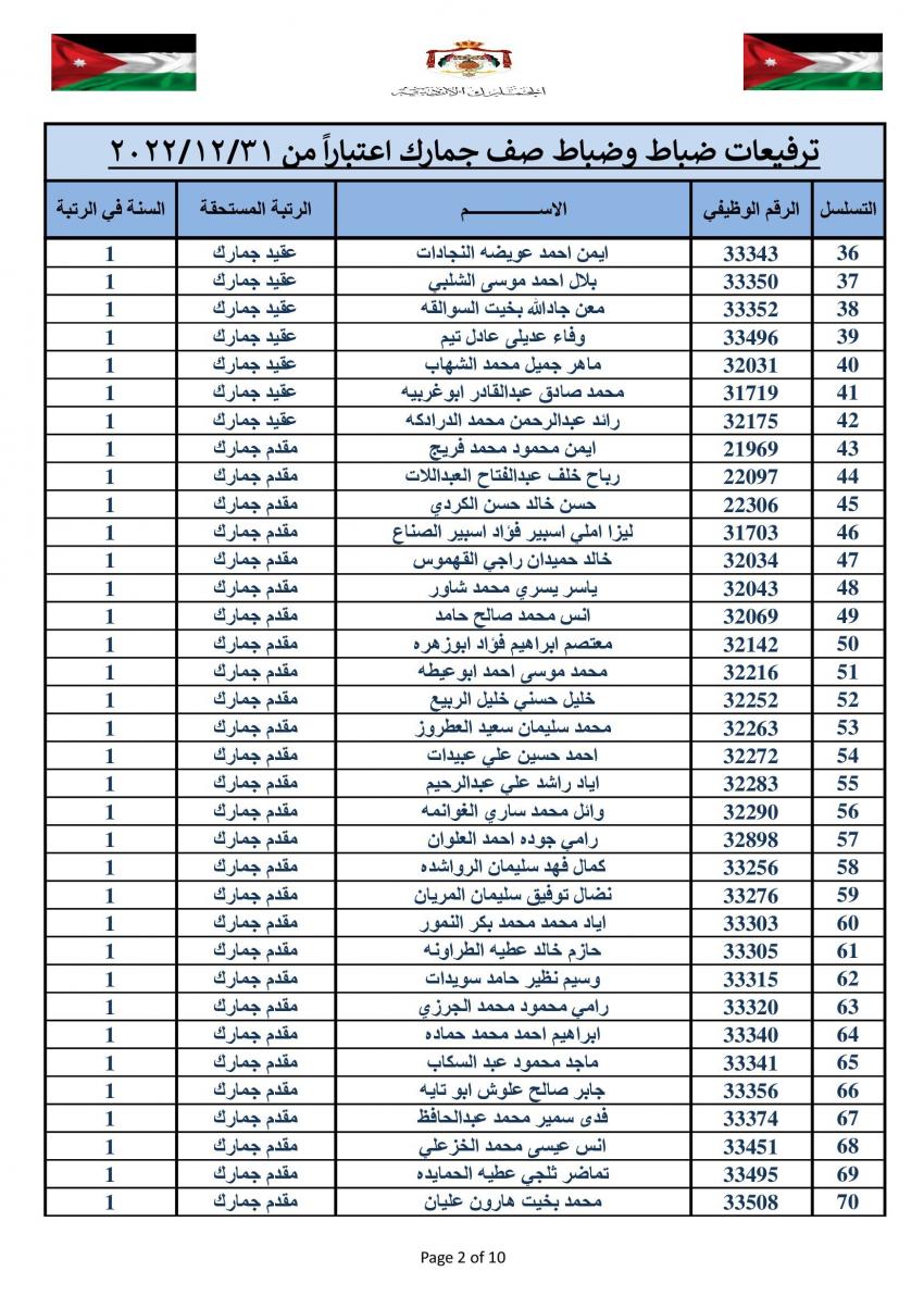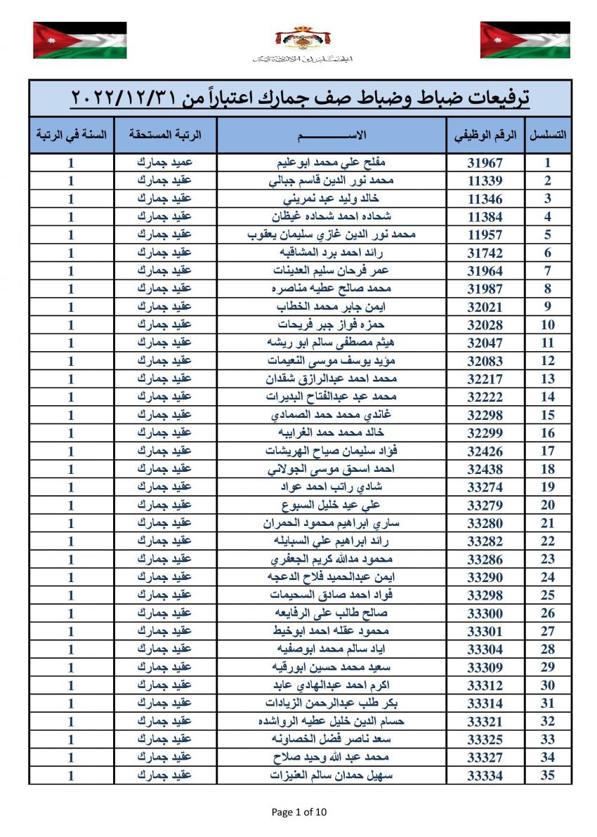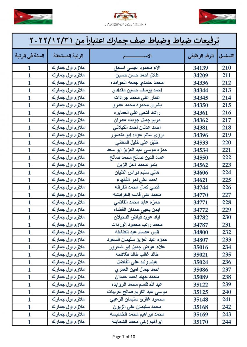 وتقدم مدير عام الجمارك الأردنية جلال القضاة بالتهنئة والتبريك الى الزميلات والزملاء الذين تم ترفيعهم الى الرتب والدرجات المبينة إزاء اسم كل منهم.
